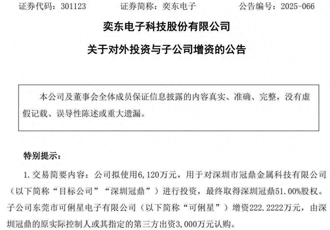 11月26日晚间,奕东电子(301123)公告称,公司拟使用6120万元对深圳市冠鼎金属科技有限公司(以下简称“深圳冠鼎”)进行投资,最终取得其51.00%股权。子公司东莞市可俐星电子有限公司(以下简称“可俐星”)增资222.2222万元,由深圳冠鼎的原执行罢休东说念主或其指定的第三方出资3000万元认购。