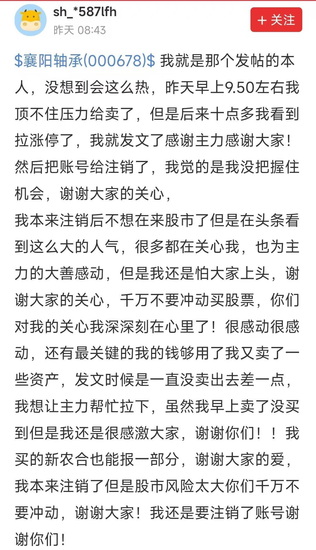 而后,关系平台上出现疑似求援股民的后续发帖致谢,该股民称:“我即是阿谁发帖的本东说念主,没思到会这样热,昨天早上9.50把握我顶不住压力给卖了,可是其后十点多我看到拉涨停了,我就发文了感谢主力感谢大家!然后把账号给刊出了,我觉的是我没主理住契机,谢谢大家的和蔼,我本来刊出后不思在来股市了可是在头条看到这样大的东说念主气,好多齐在和蔼我,也为主力的大善感动,可是我照旧怕大家上面,谢谢大家的和蔼,千万不要冲动买股票,你们对我的和蔼我深深远在心里了!很感动很感动,还有最要津的我的钱够用了我又卖了一些金钱,发文时代是一直没卖出去差少量,我思让主力襄理拉下,固然我早上卖了没买到可是我照旧很戴德大家,谢谢你们!!我买的新农合也能报一部分,谢谢大家的爱,我本来刊出了可是股市风险太大你们千万不要冲动,谢谢大家!我照旧要刊出了账号谢谢你们!”