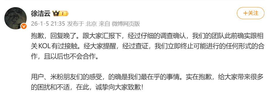 徐洁云称:“用户、米粉一又友们的感受,真是是咱们最在乎的事情。确切对不起,给众人带来好多的困扰和不适,在此,真挚向众人致歉!”