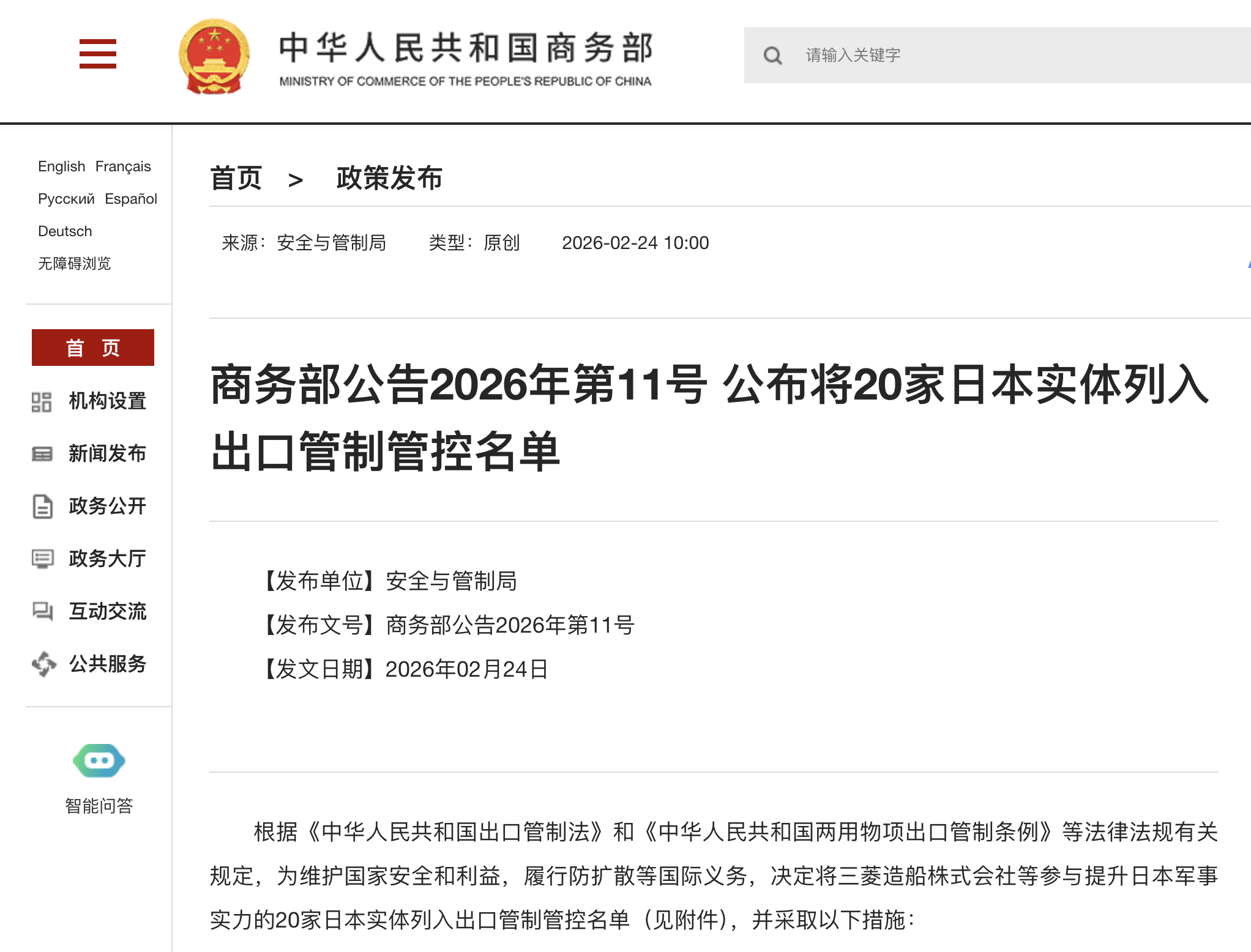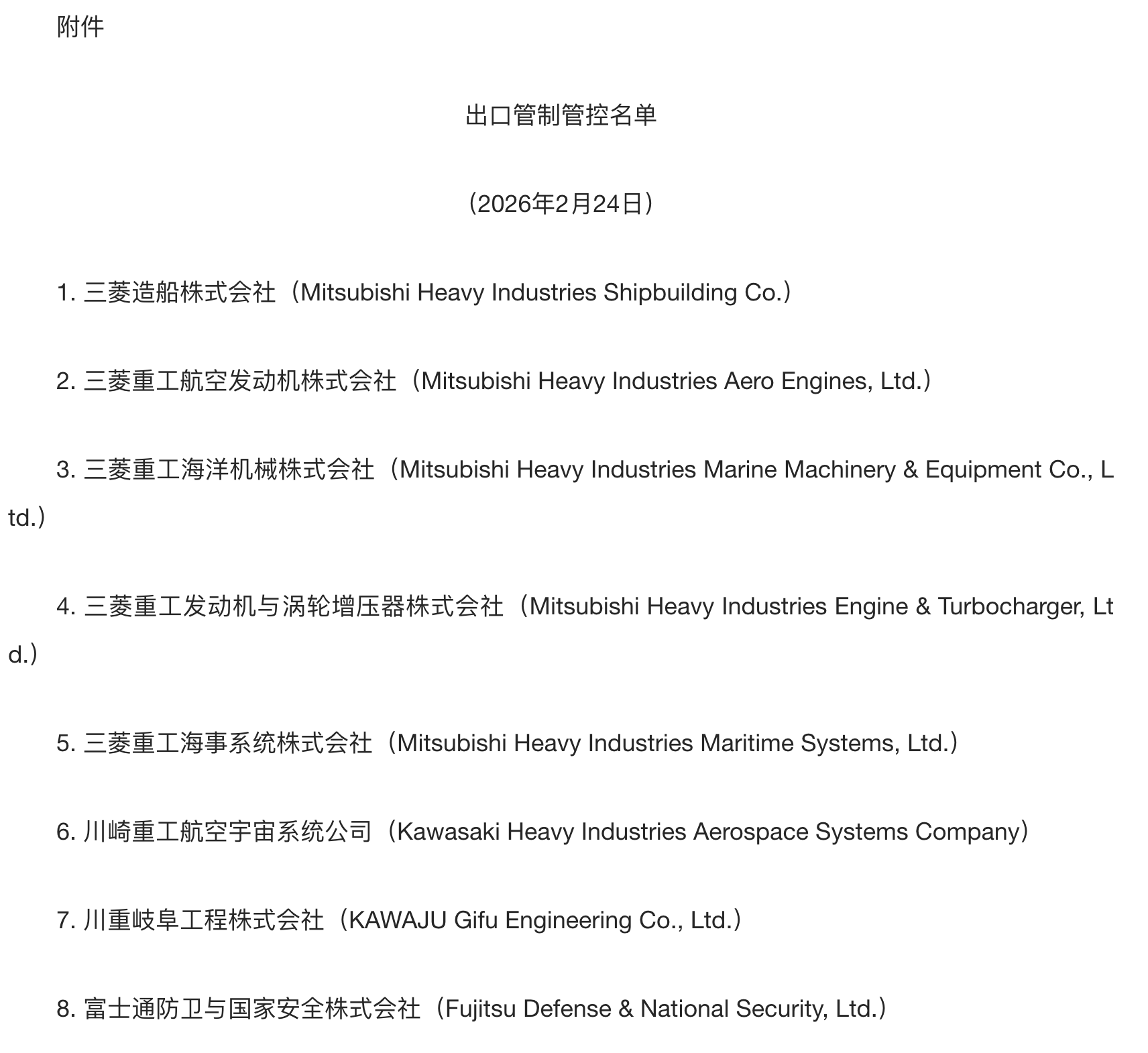 本年2月24日,中国商务部发布公告,决定将三菱造船株式会社等20家参与提高日本军事实力的日本实体列入出口管理管控名单,同期将斯巴鲁株式会社等20家无法核实两用物项最终用户与最终用途的日本实体列入关心名单。