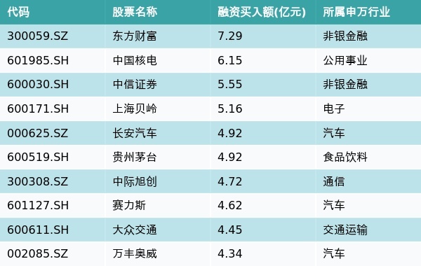 7月31日,两市共有3350只个股有融资资金买入,其中东方钞票、中国核电、中信证券名次前三,买入金额分裂为7.29亿元、6.15亿元、5.55亿元。融资买入额前10个股笃定见下表: